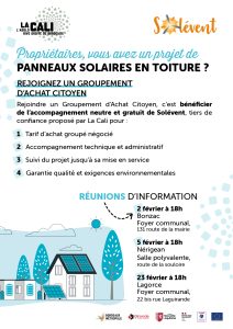 La Cali propose un groupement d’achat citoyen pour l’acquisition de panneaux solaires en toiture. Des réunions d’information sont organisées. Retrouvez toutes les infos ci-dessous.