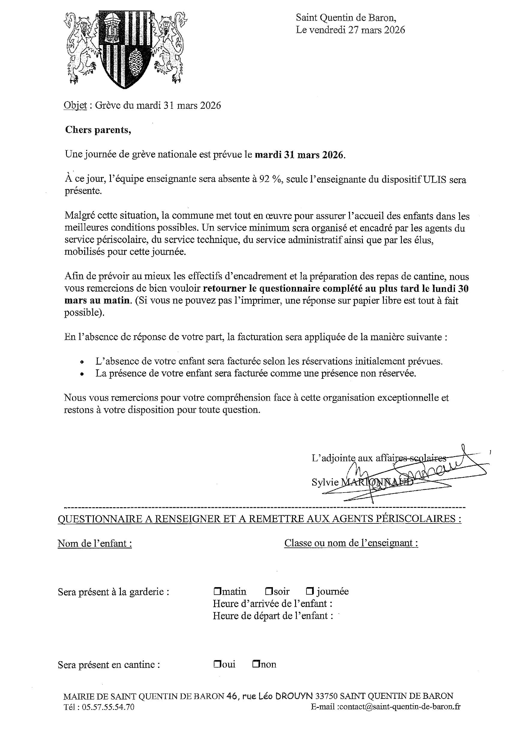 Une grève nationale est prévue le mardi 31 mars. Merci de prendre connaissance de ce courrier adressé aux parents.