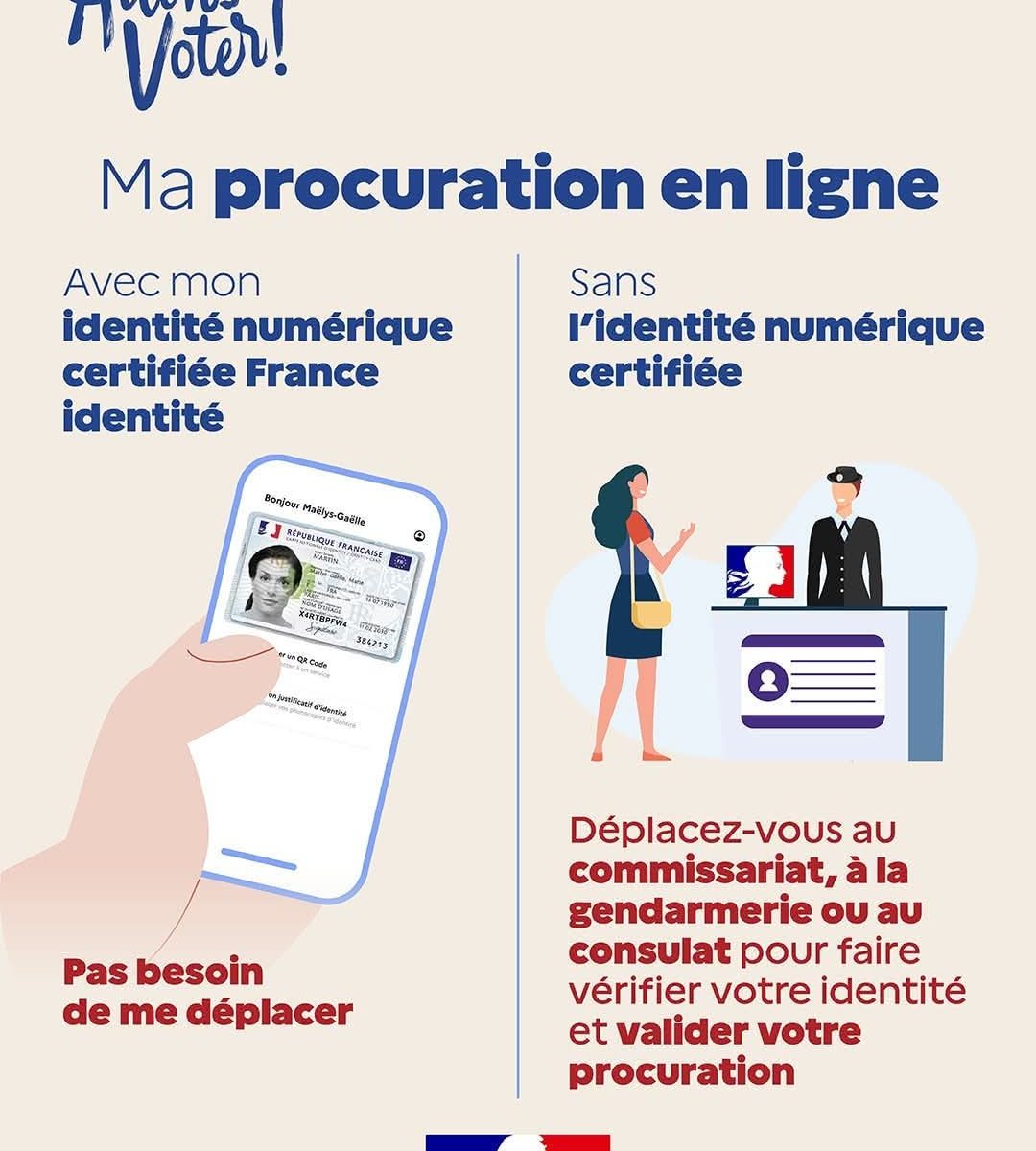 La procuration peut être réalisée en ligne sur le site Maprocuration.gouv.fr puis validée auprès d’un commissariat, d’une brigade de gendarmerie ou d’un tribunal judiciaire.